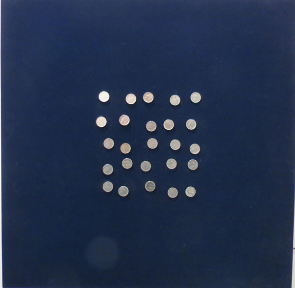 tempera su cartone e lamiera forata, 1962, cm. 61x61x6