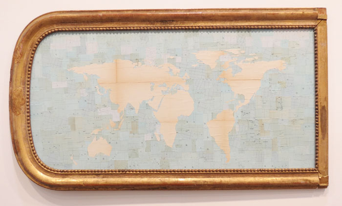 Ricomincio da S.A.L.E.S. (Roma) dove l’aggettivo “bello” si può decisamente coniugare a un’opera particolarmente felice di Flavio Favelli: un Planisferio costruito e posto al contrario per chi osserva all’interno di una grande specchiera tardo-ottocentesca inclinata orizzontalmente. L’immagine, ottenuta da vecchie mappe stradali e geografiche, è sbiadita e stropicciata, un mondo al contrario, poeticamente declinato, con i mari che risultano più definiti dal colore e dall’aspetto (anche se il “Canale di Venezia” è all’incirca in Artide…). Un capolavoro appositamente preparato per questa Fiera (non a caso è l’opera di punta della galleria) a 14.000 euro oltre IVA. Una vera meraviglia per il nostro sempre più maturo prossimo “biennaliero”.