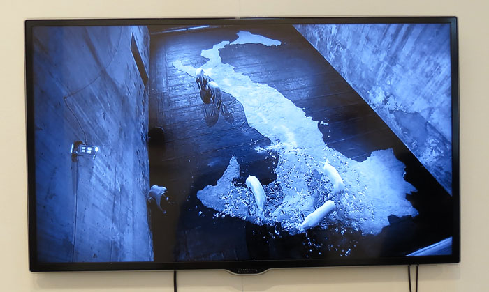 Un must per tutti i viaggiatori in Fiera è il video strepitoso di Santiago Sierra da Prometeogallery (MI). PIGS è qui in edizione unica a 22.000 euro. Il grande fotografo delle folle umane in movimento e della disperazione trattenuta dei succubi del capitalismo, lascia entrare alcuni floridi maiali in una grande stanza in cui la sagoma della penisola italiana è stata costruita a terra con prelibato pastone. Nel giro di poco tempo, l’Italia è divorata, calpestata, sonnecchiata, transumanzata, percorsa, ciondolata, rumoreggiata, distrutta con tranquilla incoscienza. Un video simile è girato per ognuno degli Stati dileggiati con l’improprio acronimo faunistico. Una grande installazione prevederà enormi fotografie stills da video, un video e altri elementi variamente composti. L’opera è di enorme impatto, ma non è ironica o sarcastica. Una quiete surreale aleggia per la stanza dei suini; inquadrature sapienti (ecco, la vera qualità di un video!) rendono questa particolare fine del mondo gioiosa e placida. Una meraviglia.