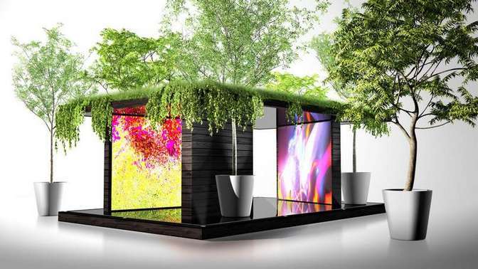 “Volevo dare una visione dell’architettura minimale, quasi semplicistica” dice Pillet. “L’esterno è piuttosto ‘bizzarro’, un semplice box di legno nero ricoperto da vegetazione. All’interno, un collage versatile e approssimativo di video-immagini casuali viene proiettato in sequenza continua senza un ordine specifico. Il visitatore non può che avere una risposta istintiva a queste interazioni molto diverse, un sovraccarico sensoriale”.