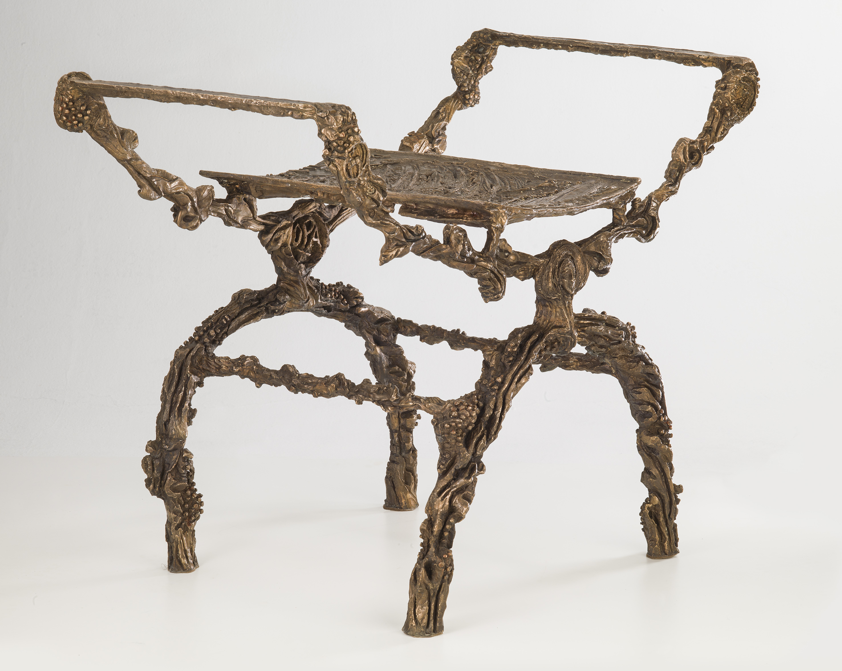 Il faldistorio creato dallo Maestro Massimo Lippi per la Cattedrale di Firenze è in bronzo eseguito con l’antica tecnica della fusione a cera persa e rifinito a mano con ceselli, alla maniera della botteghe quattrocentesche. Ispiratosi alla simbologia della vigna – tra i maggiori simboli cristiani della scultura paleocristiana, romanica e gotica – l’artista ha rappresentato una vite con grappoli di uva, gemme e tralci che percorrono il faldistorio conferendogli un significo spirituale. Nelle gemme della vite sono raffigurati la Madonna e nel lato opposto San Giovanni Battista, alla sommità dei braccioli rispettivamente San Zanobi, Santa Reparata e gli stemmi del Cardinale Giuseppe Betori e dell’Opera di Santa Maria del Fiore. Nella superficie della seduta il Maestro Lippi ha scolpito una raffinata scultura traforata, a “giorno”, che rappresenta i virgulti della vigna e altri simboli tra i quali il motto dello stemma del Cardinale “Deo et Verbo Gratiae ”, l’alfa e l’omega quale significato di Cristo inizio e fine.