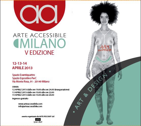 Arte Accessibile Milano, manifestazione diretta da Tiziana Manca e realizzata grazie ad Arte Ipse Dixit in collaborazione con PwC, Eventiquattro e Aston Martin, torna dal 12 al 14 aprile 2013 nel palazzo del Sole 24 ore in viale Monte Rosa 91, puntando ancora una volta ad avvicinare sempre più persone all’arte contemporanea