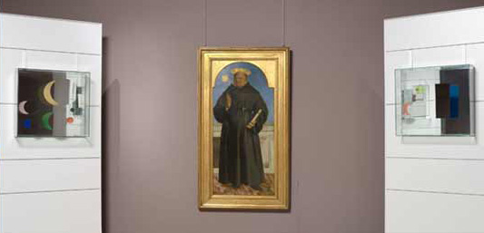 In mostra vi è anche una scultura più imponente che si rivolge frontalmente al San Nicola da Tolentino e lo contiene, in una riflessione piena ed emblematica.