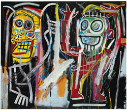 Su un intenso sfondo nero, due brillanti e colorate figure: è la massima espressione dell’arte di Basquiat. Colori e forme che sono diventate iconiche e rappresentative delle sue opere.