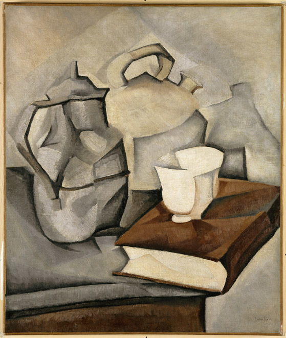 È a Montmarte che Picasso fa il suo primo attacco alla storia dell’arte: nel 1907 egli dipinge Les Demoiselles d’Avignon i cui corpi sembrano tagliati a colpi d’ascia, con sguardi inquietanti, piedi smisurati, mentre dall’insieme si desume una brutalità che fa pensare a una caricatura barbara. Una nuova sorgente d’ispirazione per Picasso: la scoperta dell’arte negra al museo del Trocadero. Quest’opera si rivela per lui come “la sua prima tela d’esorcismo”. La prospettiva è sghemba e si assiste alla distruzione della figura umana. Il seguito: la riduzione di tutte le forme a figure geometriche. Nel 1908 Louis Vauxcelles, ispirato da Les maisons de l’Estaque di Braque taccia questa pittura di “petits cubes” (piccoli cubi): è il punto di partenza del cubismo. Nella mostra della Fondation Gianadda numerose composizioni segnano la storia di questo movimento, fra cui un capolavoro del periodo del cubismo analitico: Le Guitariste, 1910, di Picasso, con una frammentazione radicale del soggetto e dei piani scomposti in sfaccettature multiple, il tutto rappresentato con una tavolozza ridotta a toni di terra. Quando poi Picasso, con la sua scomposizione dell’oggetto approda quasi alle rive dell’astrazione, Juan Gris con la sua Nature morte au livre del 1913, riconsidera il passo cubista, recuperando colori vivi e la ricostruzione dell’oggetto. Quanto a Fernand Léger, affascinato dalla rivoluzione industriale e dalla tecnica, dipinge nel 1918 Le mécanicien, in una declinazione cubista dallo stile compatto e semplificato.