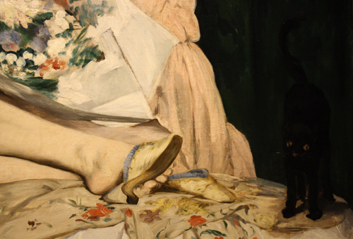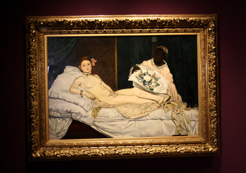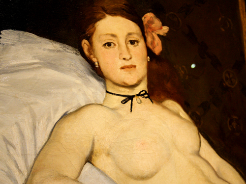Ecco la Venere di Manet: ancora lì, distesa sul letto come tre secoli prima la dipingeva Tiziano. Ma ora è diverso: prima ti desiderava, ora inchioda la tua coscienza nella tela. Sbarra il suo pube, non se lo accarezza più. Il fedele cagnolino addormentato è sparito, ai piedi del letto è comparso un gatto indemoniato, nero come la morte, simbolo di peccato. L’atmosfera della stanza si è fatta quasi claustrofobica, le tende coprono la luce del sole, delle ancelle venete rimane una schiava di colore.