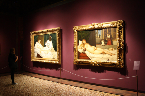 Vedere una accanto all’altra l’Olympia di Manet (1863) e la Venere di Urbino di Tiziano (1538) è già di per sé un evento eccezionale. Vedere le due fanciulle sdraiate nella stessa sala, nell’intimità dell’Appartamento del Doge, a Palazzo Ducale, a Venezia, è qualcosa di unico e forse irripetibile. Tanto più che la prostituta dell’Orsay non fosse mai uscita dall’alcova parigina, mai significa dal 1890 cioè da 123 anni. Mai si era confrontata da così vicino con la cortigiana di Tiziano, riproposta da Manet in chiave moderna. Ed ora insieme. 325 anni che le separano, una parete viola come sfondo che le unisce. Così mentre fuori il Fifre suona il piffero svolazzando sulla locandina appesa a Palazzo Ducale le due ragazze all’interno ti fissano fino all’imbarazzo. Languida e sensuale la Giulia di Tiziano, schietta e indifferente la Victorine di Manet.