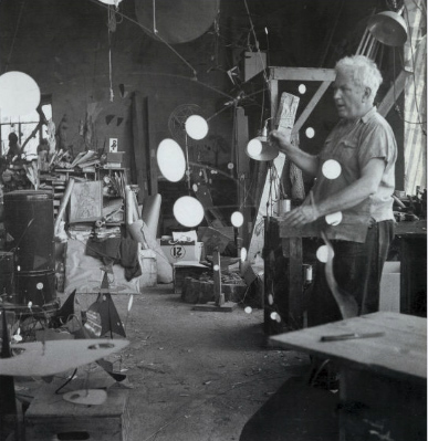Qualche anno più tardi affittò uno studio a Parigi, nel quartiere di Montparnasse, dove iniziò a produrre giocattoli articolati, da cui nacque il Circo Calder, un circo in miniatura costruito con filo metallico, spago, gomma, stracci e altri oggetti di recupero. Tutti gli oggetti potevano stare in una valigia e questo permise a Calder di improvvisare spettacoli viaggiando per l’Atlantico. Nel periodo parigino Calder incontrò e strinse amicizia con molti artisti, tra cui Joan Mirò, Jean Arp, Marcel Duchamp e Piet Mondrian. Fu grazie a quest’ultimo che decise di avvicinarsi all’astrattismo. Il Circo Calder può essere considerato come il prologo dell’arte cinetica e dei Mobile, termine coniato da Marcel Duchamp giocando sul suo doppio significato francese di “mobile” e “motivo”. I numerosi esperimenti per sviluppare la scultura astratta – a seguito dell’incontro con Mondrian – lo portarono alle prime vere sculture cinetiche, azionate per mezzo di manovelle e pulegge. Entro la fine del 1931 nacquero invece le più delicate sculture che prendono il loro moto dalle correnti d’aria degli ambienti. Ecco i veri mobiles di Calder.