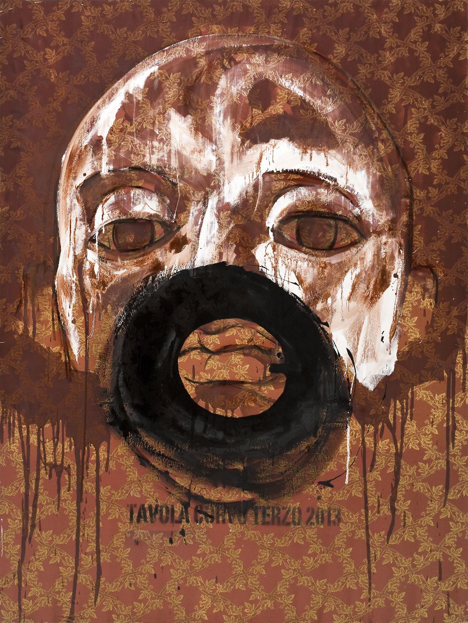 I grandi volti dipinti su vecchi tessuti (200×150 cm) sono come scudi, maschere di guardiani incorruttibili, depositari e protettori di una conoscenza –e di una verità– che nasce da una riflessione sul passato e che genera una bellezza nuova.