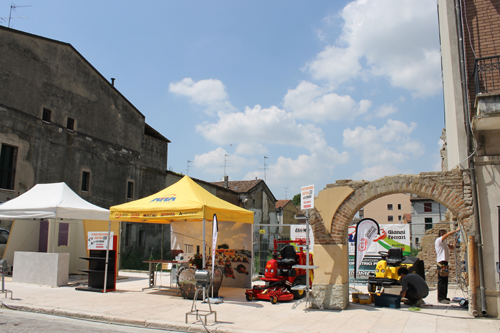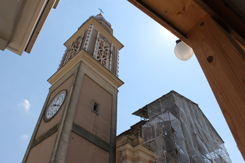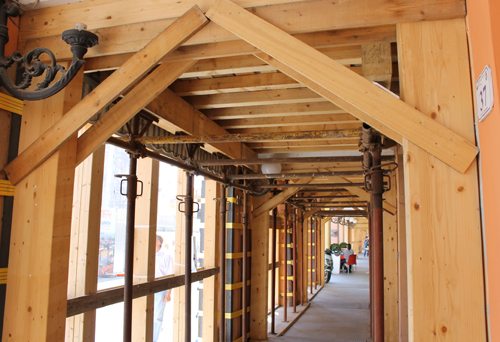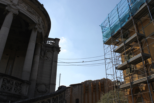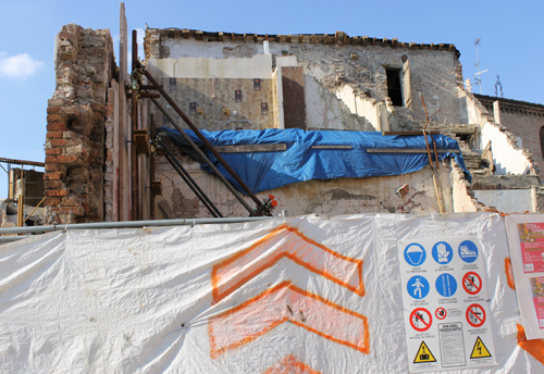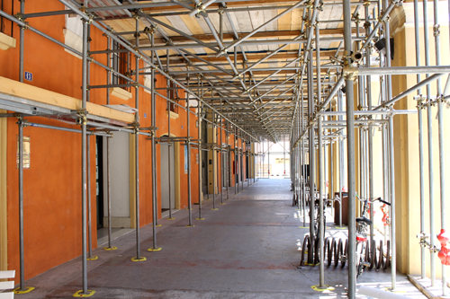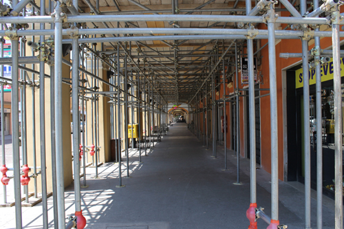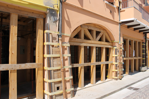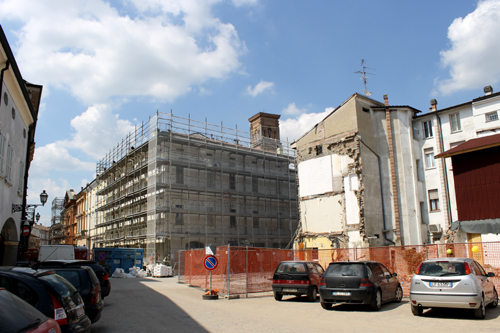 Messa in sicurezza degli edifici, abbattimento delle strutture obsolete, sgombero e pulizia delle macerie. Il primo passo è quasi fatto. Si continua a lavorare nei centri storici più colpiti mentre le realtà isolate sono a posto, almeno temporaneamente. Ragnatele di acciaio sostengono i palazzi, reticolati di metallo i portici coperti. Per le chiese i ponteggi sorreggono la facciata, i tiranti le navate, placche d’acciaio il campanile (se sta per crollare si alzano muri di contenimento) e i cavi cingono le colonne superstiti. In mancanza della volta si sistemano teloni contro le intemperie. Così come per le torri decapitate dei castelli che vengono coperte da plastiche o tettoie provvisorie. Finestre e finestrelle sono puntualmente puntellate da moduli di legno su misura. Travi e palizzate si alternano di continuo creando architetture e installazioni pseudo-contemporanee.