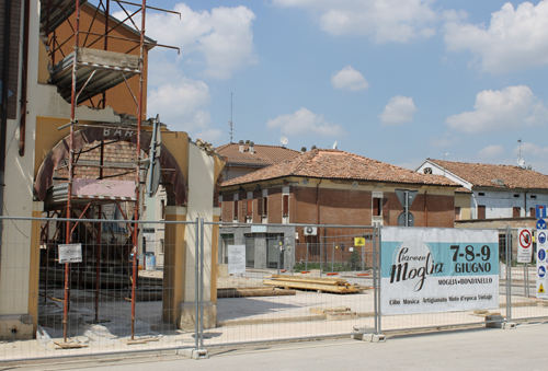 Questo è lo scenario (surreale) che si presenta ad un anno dal terremoto nei paesi più colpiti dal sisma: Moglia, Poggio Rusco, San Bendetto Po, Novi di Modena, Concordia sulla Secchia, Crevalcore, Cavezzo, Medolla, Mirandola, San Felice sul Panaro, Finale Emilia, Sant’Agostino. Atmosfera post-bellica. I segni della stangata tellurica ancora assai evidenti. Piazze transennate, vie deserte, abitazioni abbandonate, negozi vuoti, scuole chiuse, chiese aperte (nel senso senza un tetto) e municipi, se ci son ancora, “decorati” per intero da impalcature. Paesi sfregiati dove quei simboli identitari-comunitari sono scomparsi o al meglio ricoperti di ferro per non farli venir giù e quindi irriconoscibili. Un cantiere infinito su cui si sta lavorando incessantemente. C’è un mondo da ricostruire, una normalità da ritrovare. Il primo passo è ormai compiuto. L’Emilia colpita pian piano si rialza.