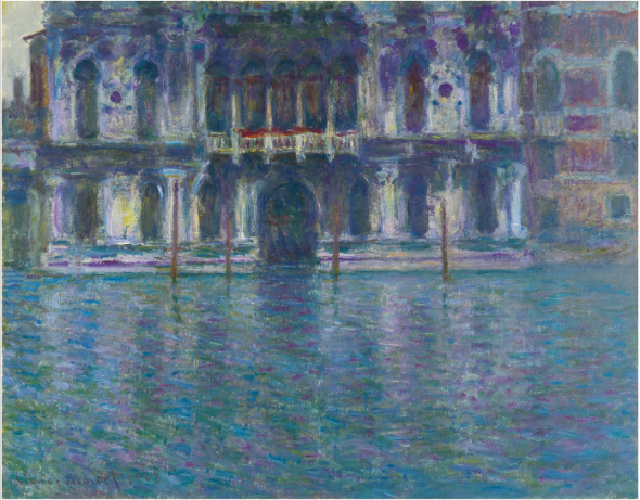 Affascinato dall’acqua, come già era successo per le vedute del Tamigi, Monet a Venezia era rimasto colpito dalla vicinanza degli edifici al bordo dell’acqua, e questo lo aveva portato ad esplorare le composizioni più astratte, accentuando l’interazione tra i ritmi della facciata decorata, con le sue aperture ad arco e le divisioni orizzontali, con il ritmo dell’acqua.