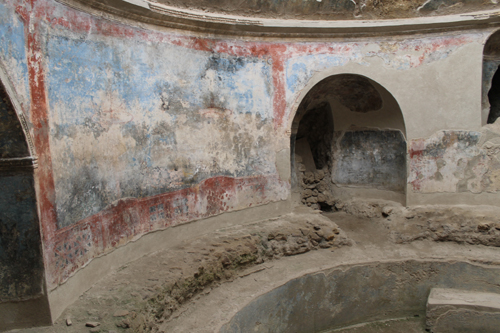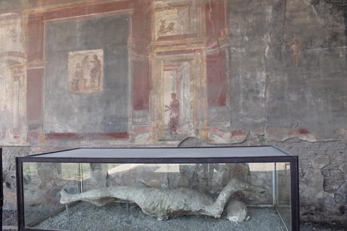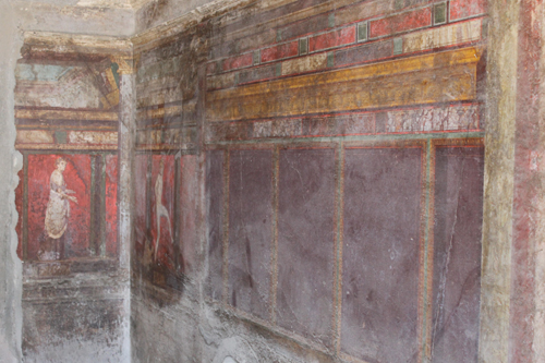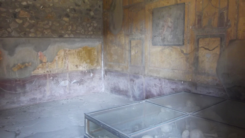 Cambiamo zona, da Sud ci spostiamo a Nord Ovest oltre il Regio VI. Per l’intera Via dei Sepolcri fino alla Villa dei Misteri non c’è l’ombra di un guardiano nel raggio di chilometri. Anarchia assoluta. Si entra e si esce dalle tombe della necropoli tranquillamente dato che palizzate e transenne di “divieto” sono divelte o distrutte. Poi, sempre con molta calma e senza che nessuno ti dica qualcosa, proseguiamo la visita tra le varie strutture sepolcrali arrivando alla mitica Villa dei Misteri, della quale – forse fortunatamente – solo una piccola parte è aperta al pubblico. Eccoci all’ennesimo scempio, scandalo o vergogna pompeiano-nazionale: nessuno che controlla le meravigliose pareti affrescate lasciate alla mercé dei turisti sperando (o confidando in maniera azzardata visto il risultato) nella magnanimità del turista medio di non portarsi via o vandalizzare alcunché. L’unica presenza pseudo ufficiosa del luogo è il venditore di gelati e panini appena fuori dall’uscita a fianco alla residenza che improvvisatosi Cicerone del posto in maniera “molto gentile” spiega ai turisti sperduti la strada da seguire per visitare gli affreschi migliori: il ciclo pittorico 17 per 3 metri che si richiama al culto misterico di Dioniso, il più grandioso lasciatoci dall’antichità. Meraviglioso e miracolosamente preservato da una cordicella approssimativa che vieta l’ingresso, uno sguardo da fuori basta e avanza visto cosa succede alle pareti accanto. Infatti il problema e lo scandalo sono dietro l’angolo (o dietro l’affresco): la parte visitabile che conduce al celebre affresco è completamente trascurata e lasciata a se stessa così da subire l’infame destino di tutte le pitture pompeiane (di primo, secondo, terzo e quarto stile): sbriciolamento e sgretolamento, infiltrazioni d’acqua, polvere e incrostazioni, guano d’uccelli, graffiti lasciati da mani indegne o da borse, zaini e oggetti contundenti che sfregiano e sfregano volontariamente o meno le pareti. Una cosa pazzesca per delle pitture del genere, uniche al mondo, un tesoro inestimabile lasciato al degrado più assoluto.