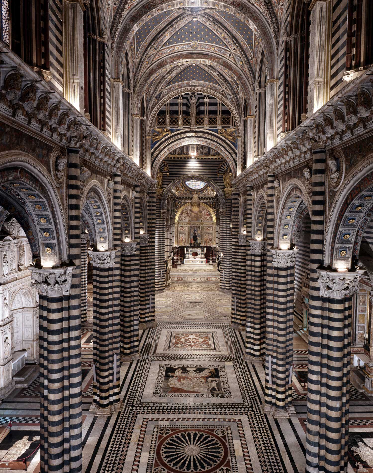 Nelle tre navate l’itinerario si snoda attraverso temi dell’antichità classica e pagana: la Lupa che allatta Romolo e Remo, l’egiziano Ermete Trismegisto, le dieci Sibille, i filosofi Socrate, Cratete, Aristotele e Seneca. Nel transetto e nel coro si narra invece la storia del popolo ebraico, le vicende della salvezza compiuta e realizzata dalla figura del Cristo, costantemente evocato e mai rappresentato nel pavimento, ma presente sull’altare, verso cui converge l’itinerario artistico e religioso.