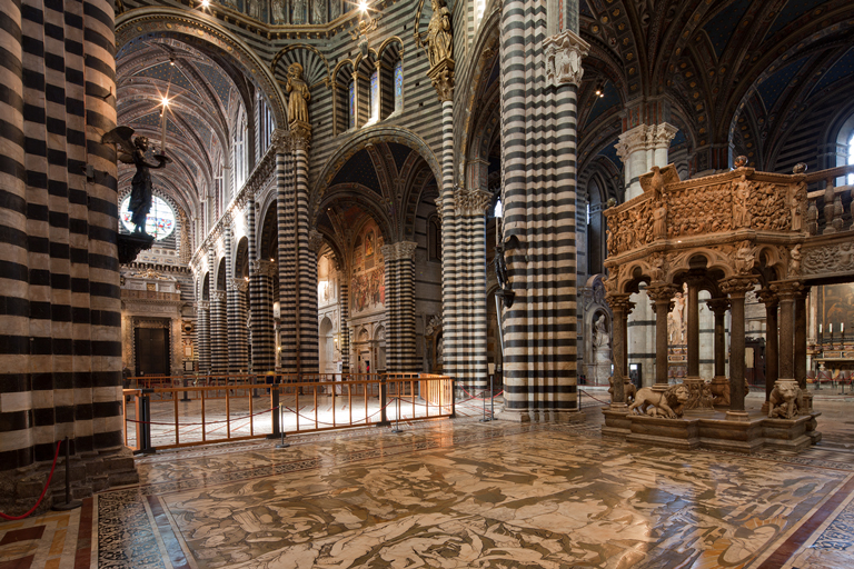 Una volta giunti sopra le volte stellate della navata destra inizia un itinerario riservato a piccoli gruppi che, accompagnati da un’esperta guida, potranno camminare ‘sopra’ il sacro tempio e ammirare gli interni del Duomo e gli esterni della città. Attraverso le vetrate dal tamburo della Cupola, si potrà inoltre osservare il pavimento nel suo insieme da una prospettiva diversa rispetto a quella abituale. Dal ballatoio della contro facciata si potrà inoltre godere della vista generale sulle tre navate con le tarsie raffiguranti i personaggi del mondo antico.