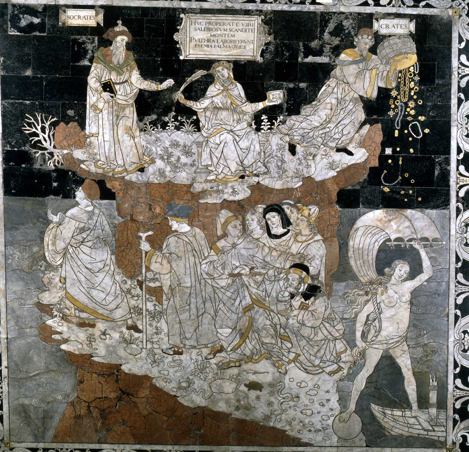 Il pavimento del Duomo è il risultato di un complesso programma iconografico realizzato attraverso i secoli, a partire dal Trecento fino all’Ottocento. La tecnica utilizzata è quella del graffito e del commesso con marmi di provenienza locale. I cartoni preparatori per le cinquantasei tarsie furono disegnati da importanti artisti, quasi tutti “senesi”, fra cui il Sassetta, Domenico di Bartolo, Matteo di Giovanni, Domenico Beccafumi, oltre che da pittori “forestieri” come l’umbro Pinturicchio, autore, nel 1505, del celebre riquadro con il Monte della Sapienza, raffigurazione simbolica della via verso la Virtù come raggiungimento della serenità interiore.