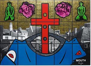 Al contrario sta Gilbert e George fanno riferimento a un immaginario cristiano che, nella sfida di una devozione religiosa, incorpora il secolare. L’opera non è meditativa, ma impressionante e destinata a sconvolgere lo spettatore. L’immagine comprende una croce centrale, due fiori forse simboli della Vergine e della Maddalena, e due giovani uomini in ginocchio. Gilbert è nato nelle Dolomiti, in Italia, nel 1943, George nel Devon nel 1942 e vivono e lavorano insieme a Londra. Hanno partecipato a molte importanti mostre collettive tra cui la 51 ° Biennale Internazionale di Venezia (2005), Tra i loro premi il The Turner Prize (1984) e il Carnegie International (1985).