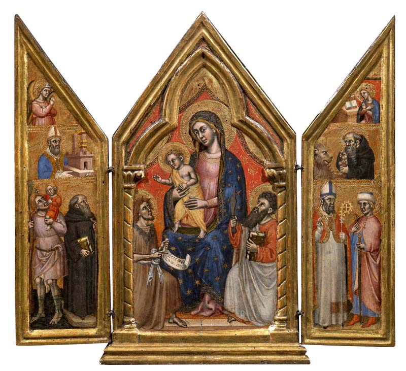 Una delle prime opere in mostra, una scelta ideale in quanto raffigura ben otto Santi, è un trittico della “Vergine col Bambino tra i santi Giovanni Battista e Bartolomeo (pannello centrale), Arcangelo Gabriele, Santi Petronio, Cristoforo e Antonio (pannello di sinistra ); Vergine Annunziata, San Girolamo, un Santo Vescovo (Ambrogio) e San Floriano (pannello di destra)” dell’artista bolognese, Simone di Filippo, detto ‘dei Crocifissi’, (documentato dal 1354, morto 1399?). In ottime condizioni, questa piccola opera era destinata alla devozione privata ed è un importante aggiunta al numero di trittici conosciute da questo celebre pittore. La scelta dei Santi raffigurati suggerisce una provenienza bolognese: il busto di San Petronio è raffigurato tenendo in mano la città di Bologna, che indica il suo ruolo come il ricostruttore della città nel periodo tardo antico, iconografia che divenne comune in cui il Santo è stato scelto come primo patrono della città nel 1376. Floriano è anch’egli un Santo patrono di Bologna, riconoscibile per le sue vesti aristocratiche, la spada di un nobile cavaliere e il fiore in mano. Può essere che il vescovo raffigurato accanto a San Floriano sia Sant’Ambrogio, un altro patrono di Bologna.