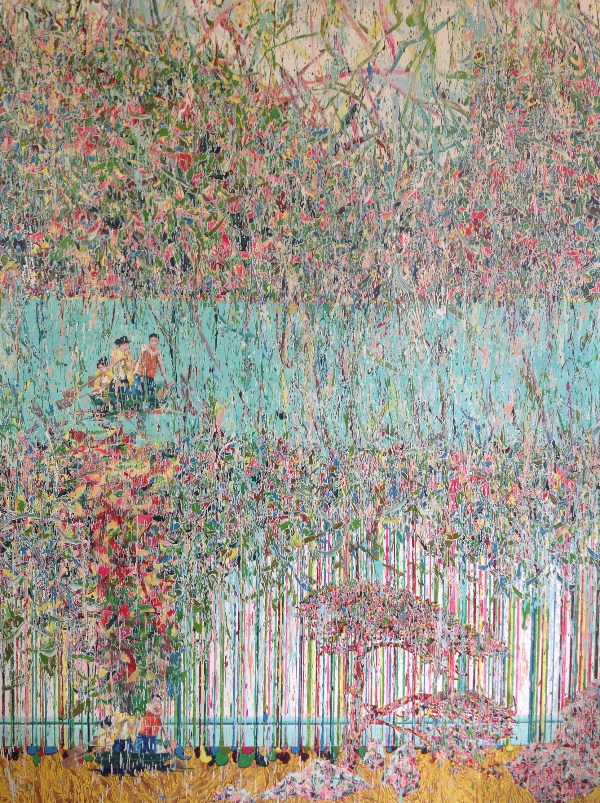Ecco che in una saletta accanto alla spettacolare vetrata del Palace Hotel, scenograficamente affacciata sul lago, sono esposti i lavori dell’artista cinese Fang Lijun. Modesto l’allestimento e inclemente l’illuminazione, a confronto della cura di ogni dettagli negli ampi ambienti del 5 stelle che la ospita, la piccola mostra è una delle tante dedicate in questa edizione alla Cina.