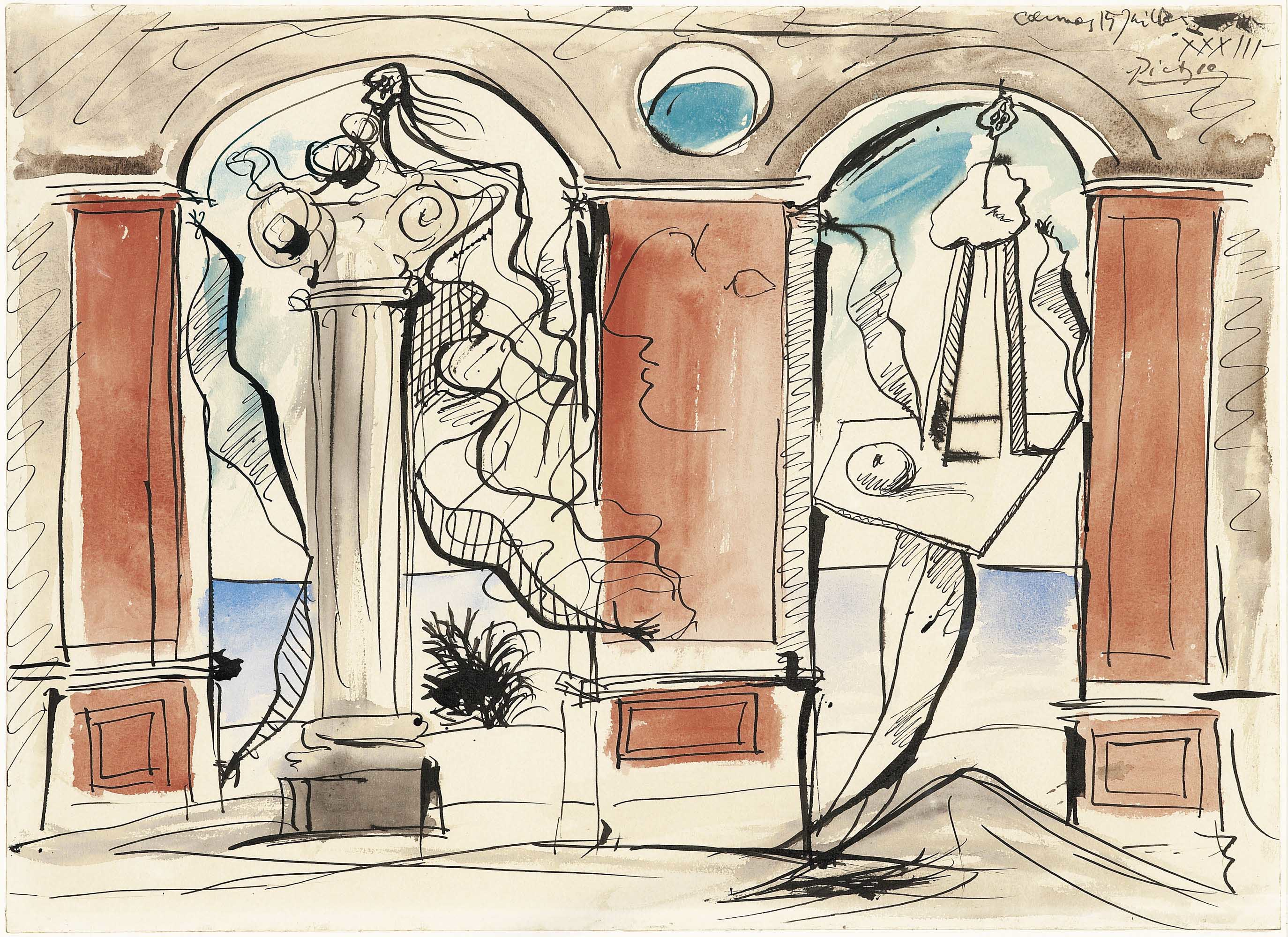 Prima a Villa Les Sables a Juan-Les-Pins nell’estate del 1920, con l’ex danzatrice Olga Khokhlova, madre di Paulo, quel bambino che tutti ricordiamo vestito da arlecchino, visibile nella sezione accanto proprio così mascherato in una rara tela del 1923-24. Con Olga risiede poi nel 1923 all’Hôtel du Cap, in quell’angolo di paradiso che è Cap d’Antibes, ma ha bisogno di un atelier perché l’impulso di dipingere anche durante le vacanze estive è troppo forte.