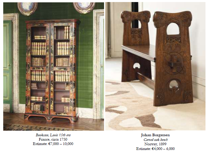 Tra i pezzi proposti all’asta una libreria in stile Luigi XV, con una decorazione di ispirazione cinese, stimata €7.000-10.000, testimonia il gusto e l’apprezzamento di Demachy per le culture straniere. L’asta continua con un paio di sedie realizzate dall’ebanista Jacob-Desmalter, in precedenza proprietà del Senato francese (stimate €8.000-12.000); segue un armadio neorinascimentale in ebano realizzato da Husinger & Wagner, stimato €5.000-8.000, che rivela la sua attenzione e sensibilità per l’aspetto creativo dell’arte decorativa del XIX secolo.