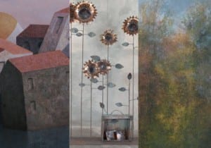 Sono caos puro gli alberi di Arcangelo Ciaurro (1953). Grovigli di colore e di materia che parlano della via lattea e di brulicanti microcosmi cellulari. Costruiti a macchie e graffi, seguendo un ritmo tutto emotivo, raccontano storie primordiali intessute di un ordine superiore che l’artista ci rammenta continuamente, scegliendo rigorosamente supporti che siano perfettamente quadrati. E’ invece un ordine quasi geometrico, per certi versi marziale, quello che Mario Branca (1977) impone alle sue schiere metalliche di girasoli, alle sue piante dalle fioriture parallele e simmetriche. Eppure quelle piante sono vive, respiranti, dotate di un’anima. Talvolta fatate e poi, improvvisamente, crudeli, con quelle foglie affilate come lame pronte a colpire. E poi c’è il mondo di Matthias Brandes (1950), un mondo scabro, dall’apparenza immobile e pietrosa, costruito a olio e tempera su tela. Lì, tra quelle case assiepate, tra quegli alberi compatti come monoliti, l’ordine e il caos si alternano, si contraddicono, giocati nel contrappunto tra il rigore delle geometrie e dei volumi giotteschi e la follia della costruzione e della scansione spaziale. Un contrappunto dagli equilibri unici, dalle perfette armonie.