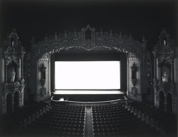 Nel 1978 HIROSHI SUGIMOTO iniziò la serie ‘Theaters’, immagini – con tempi di esposizione lunghissimi – di drive in, sale degli anni ’20 e ’30, e cinema degli anni ’50 rappresentati durante le proiezioni. Il tempo di esposizione utilizzato per la fotografia corrisponde al tempo di proiezione del film, ciò gli consente di salvare la durata dell’intero film in un solo scatto. Ciò che rimane visibile è il luminoso schermo del cinema, che illumina l’architettura dello spazio. La pellicola si presenta quindi come il rapporto tra tempo e percezione spaziale.