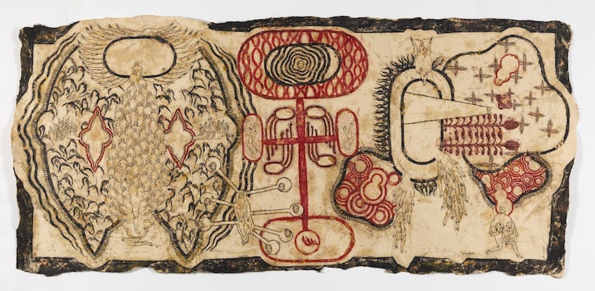Caratteristiche dell’artista sono le grandi carte da spolvero che sembrano far parte di un’unica grande composizione che perviene smembrata, come una frammentazione in cui si assiste allo sviluppo di alfabeti simbolici che reinterpretano un sapere accumulato nel tempo.