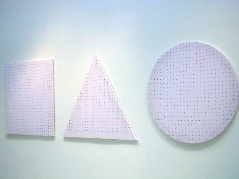 Alle pareti un arazzo di Donzelli, una tela della Accardi, un pallet del giovane Mercier, poi Lavier, Maljkovic. Tre grandi tele della Beecroft riportano ai suoi primi disegni, alle donne rosse, algide, anonime e infeconde. Davanti a esse un ambiente di Dan Graham, grande amico e compagno di viaggio di Minini, col quale porta le sue riflessioni sulla vetrina, i muri trasparenti di ostentazione, dialogo e rispecchiamento. Il filo rosso di Letizia Cariello ricama rigide tele geometriche e ci parla delle donne, dei loro legami e dei loro vincoli.