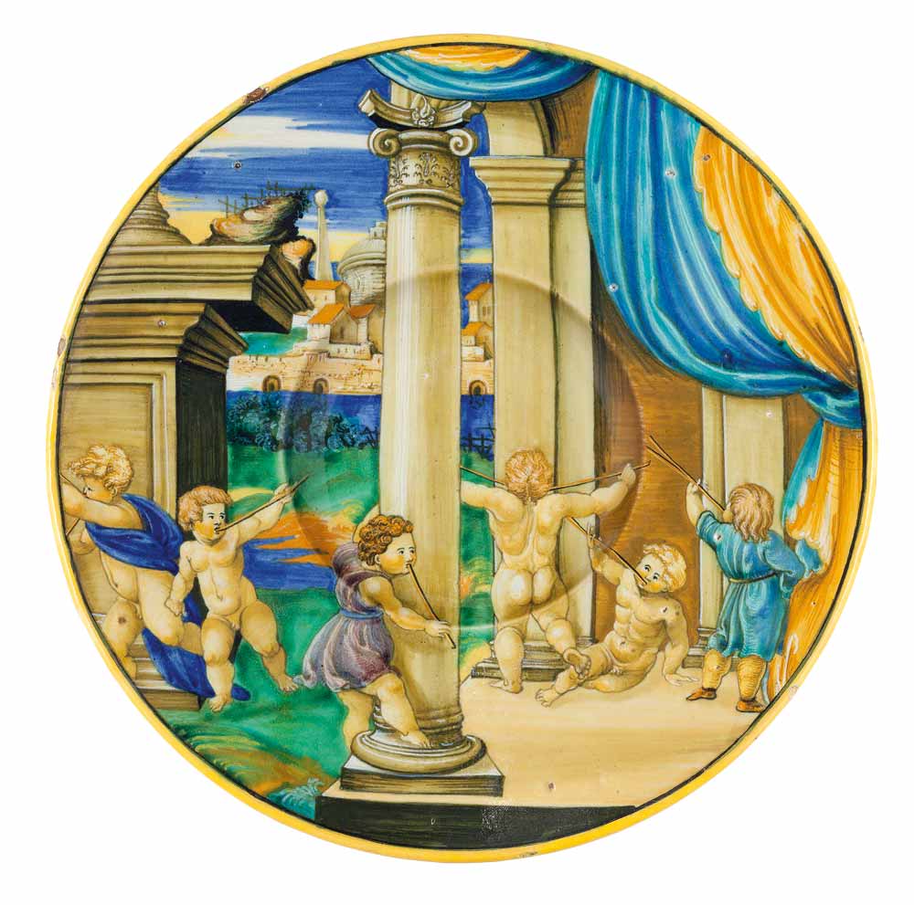 Di eccelsa qualità e di spessore museale, un piatto istoriato con giuoco di cerbottana di sei putti della fase giovanile di Francesco Xanto Avelli, che si caratterizza per caratteri stilistici tipicamente “xantiani” (tavolozza di colori accesi e brillanti, segno di contorno sicuro e vigoroso, scenica capacità di allestire lo spazio con architetture classiche), cui unisce il gusto per l’intreccio allegorico, che