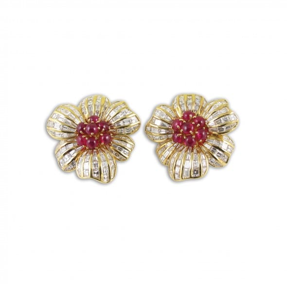 ORECCHINI, VAN CLEEF & ARPELS in oro giallo con diamanti baguettes 10 ct ca., colore indicativo F/G IF-VVS e rubini cabochon. Valutazione € 12.000 – 16.000