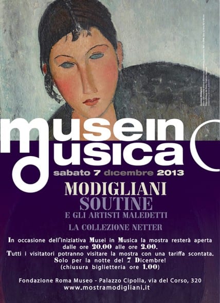 Visto il grande successo, la mostra “Modigliani, Soutine e gli artisti maledetti. La collezione Netter” (a cura di Marc Restellini, Museo Fondazione Roma – Palazzo Cipolla, 14 novembre 2013 – 6 aprile 2014) aderisce alla manifestazione “Musei in Musica” e sabato 7 dicembre resterà aperta al pubblico straordinariamente dalle ore 20.00 alle ore 2.00 (la biglietteria chiude un’ora prima).