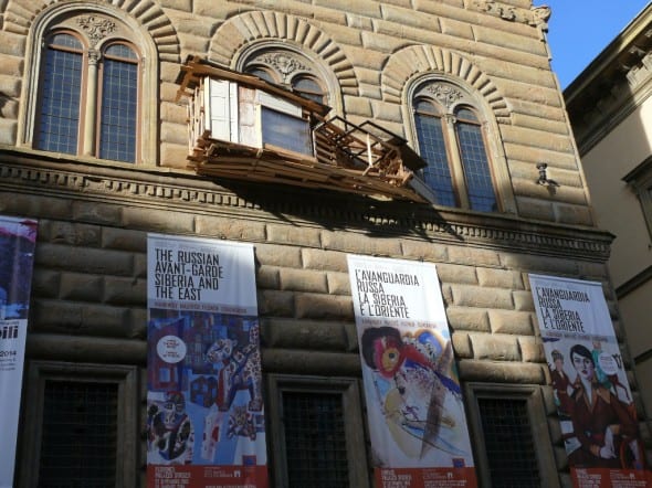 L’impatto con questa mostra inizia già all’esterno, arrivate a piazza Strozzi, guardate in alto: superate la sensazione di profanazione del Rinascimento e quel nido di legno, abusivo, all’angolo destro della facciata del Palazzo vi sembrerà una posizione invidiabile, punto di congiunzione tra un’architettura antica e una impermanente, come i nostri tempi.