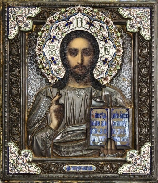 Una icona russa del XIX sec con Cristo benedicente è stato il top lot dell’asta di Maison Bibelot. Appartenuta alla collezione di S.Bulgari, l’icona russa della fine del XIX secolo con un Cristo benedicente, di squisita fattura pittorica e racchiuso in una preziosa ritza d’argento e smalti cloissoné, con un lungo duello telefonico è stata aggiudicata per 24.300 euro decuplicando il valore base di 2.000. Tutte aggiudicate anche le altre icone in asta.