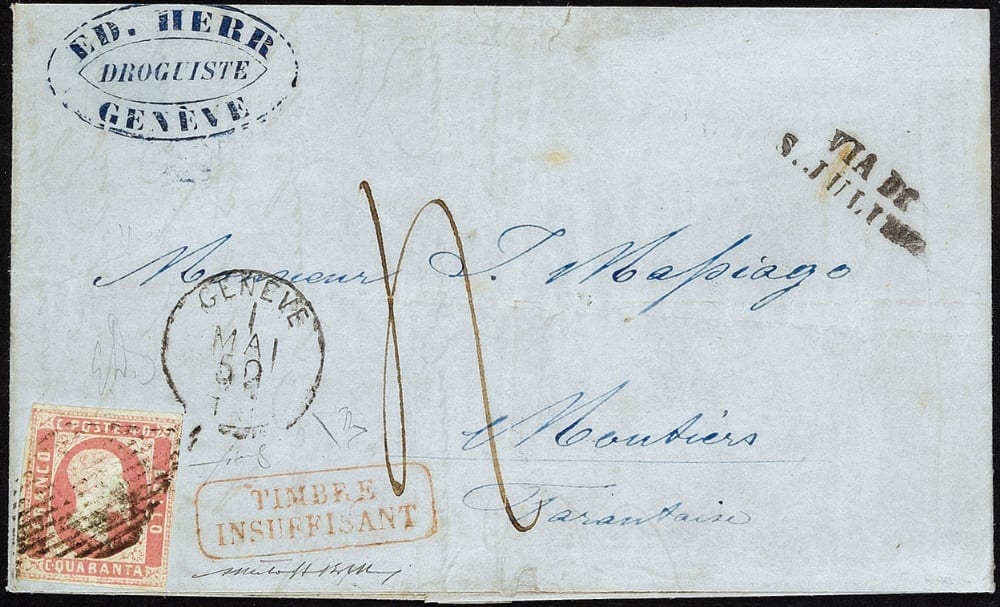 È la busta spedita da Ginevra a Moûtiers il 1° maggio 1852, affrancata con il 40 centesimi della prima emissione del Regno di Sardegna, uno dei pezzi unici della filatelia italiana in vendita all’asta Bolaffi il 12 e 13 dicembre. La lettera, che sarà dispersa da 15 mila euro, è la sola conosciuta inviata dalla Svizzera e affrancata con la prima emissione sabauda.