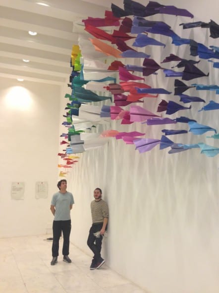 Bene, mi sento rasserenata. Tornando a noi… A proposito di influenze, i Paper Planes sono un chiaro omaggio ad Alighiero Boetti. La sua influenza nella vostra opera si vede però anche altrove, perfino nelle vostre lettere, che quantomento nell’intenzione ricordano le frasi e i motti scritti e dipinti da lui; oppure nell’utilizzo di materiali inconsueti come si trattasse di pixel cromatici. Quali sono le altre vostre importanti influenze?