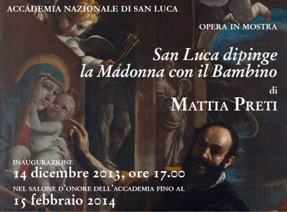 Roma. Per celebrare il “IV centenario della nascita di Mattia Preti” l’Accademia Nazionale di San Luca espone nel Salone d’onore il dipinto raffigurante San Luca dipinge la Madonna con il Bambino, proveniente dalla chiesa di San Francesco d’Assisi a La Valletta. Inaugurazione: sabato 14 dicembre 2013 ore 17.00