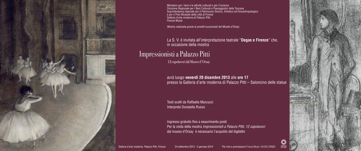 Per salutare la conclusione della mostra Impressionisti a Palazzo Pitti. 12 Capolavori dal Museo d’ Orsay, che chiuderà i battenti il prossimo 5 gennaio, la Direzione della Galleria d’arte moderna di Palazzo Pitti ha il piacere di ricordare il legame tra gli artisti francesi ed gli italiani presentando una conferenza ed una pièce teatrale dedicata alla presenza di Degas a Firenze, recitata da Donatella Russo su testi selezionati dalla studiosa Raffaella Marcucci.