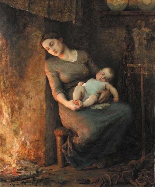 Una donna che culla un bambino addormentato accanto al fuoco, assorta nelle sue preoccupazioni, è l’interpretazione di Vincent van Gogh di un dipinto dallo stesso titolo di un’artista sua contemporanea sul tema del “marinaio in mare”: l’opera, realizzata dalla pittrice francese Virginie Demont-Breton, era stata esposta al Salon del 1889, dove aveva ricevuto grandi elogi.