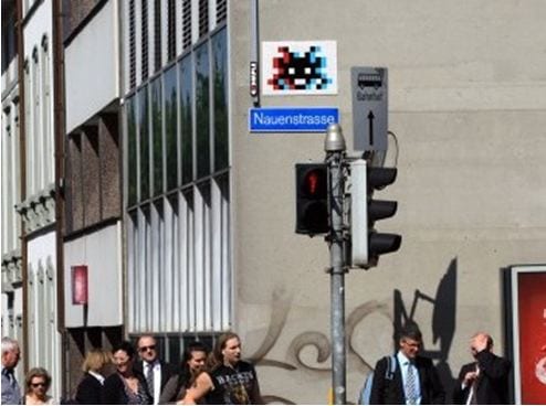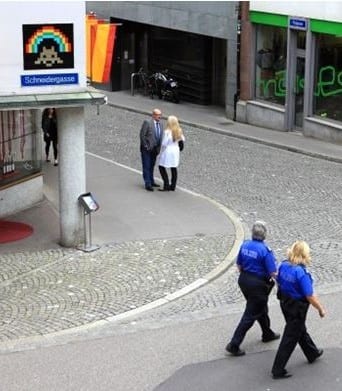 Anche quando non ne fa una facile rappresentazione telescopica (come nel 1999 a Montpellier con Zevs, nell’ambito del comune progetto @nonymus), Invader mette i suoi segnaposto in luoghi che crediamo di conoscere a sufficienza, la cui fisionomia crediamo verificata una volta per tutte, e che invece non sono nient’altro che mosaici: all’improvviso una tessera può cadere, o essere sostituita. Invader ce lo ricorda, ci ricorda che l’ordine di un universo ordinato, fatto di moduli e tessere, può essere assai instabile (ed è per questo che le forze appunto dell’ordine si allertano, e ogni tanto lo arrestano). www.space-invaders.com
