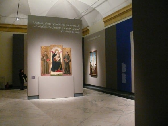 Circa 50 sono le opere, provenienti da musei italiani pubblici, privati e da collezioni private (Umberto Veronesi e Fondazione Santarelli), esposte nelle spaziose sale che ne consentono una visione a diverse distanze, necessarie per apprezzare sia la raffinatezza dei particolari che la visione di insieme, come per gli affreschi staccati della Camera di Santa Caterina, per la prima volta riuniti dalle loro sedi di provenienza (Chiesa Santa Maria sopra Minerva e Ordinariato Militare a Magnanapoli). La committenza delle pale d’altare, dei quadri devozionali, dei cicli decorativi di Antoniazzo non era costituita dalla corte pontificia ma dalle confraternite, dai prelati stranieri o dai rappresentanti dell’aristocrazia di provincia, un pubblico legato alla tradizione artistica e culturale. L’ultima tavola realizzata a Roma, per il giubileo del 1500, Annunciazione e il cardinale Torquemada, si trova ancora sull’altare della cappella della confraternita dell’Annunziata della Chiesa di Santa Maria sopra Minerva.