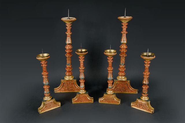 Il corredo d’altare in oggetto è registrato presso l’Archivio Storico della Santa Casa alla data 5 gennaio 1722 come dono del principe Caracciolo d’Avellino al Santuario della Santa Casa. Il corredo, di manifattura trapanese (sec. XVI-XVII), comprende un crocifisso, tre carteglorie, due candelieri grandi, sei candelieri medi e quattro candelieri piccoli.