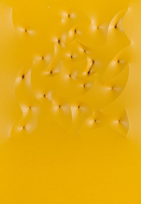 tela estroflessa gialla cm. 60×40, firma e titolo al retro, dichiarazione d’autenticità dell’artista su foto, opera priva di cornice.