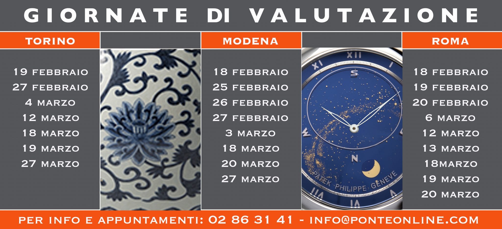 La storica casa d’aste milanese Il Ponte, che celebra quest’anno i 40 anni di attività, in vista del primo semestre di vendite sta selezionando opere da inserire nei cataloghi delle prossime aste di Arte Orientale, Gioielli e Orologi, Arte Moderna e Contemporanea, Arredi, Dipinti Antichi e del Sec. XIX, Fashion Vintage, Libri e Incisioni, Design e Arti applicate del ‘900. Oltre che nella prestigiosa sede di Palazzo Crivelli in Via Pontaccio 12 a Milano, dove è possibile recarsi su appuntamento, sono in programmazione giornate di valutazioni gratuite di singoli lotti o intere collezioni anche a Torino, Modena e Roma.