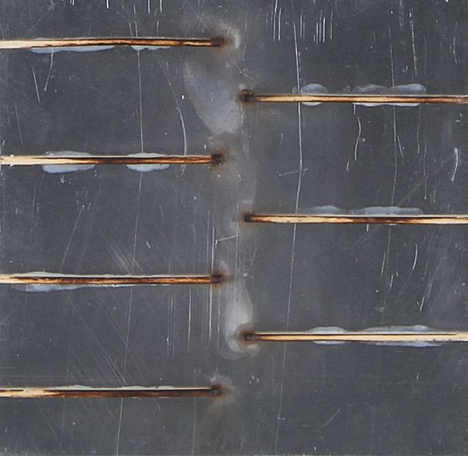 fiammiferi bruciati su lamiera cm. 20×20, firma e anno al retro, dichiarazione d’autenticità dell’artista su foto.