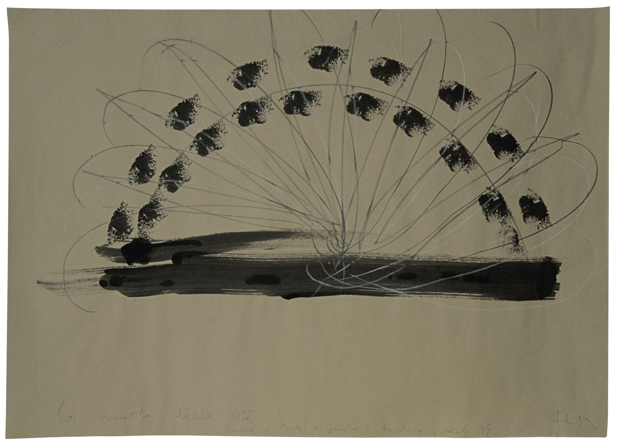 Nella ricerca di Fabro la dimensione ambientale riveste un’importanza fondamentale: lo spazio è infatti concepito come campo d’azione vivo, fatto di relazioni e necessarie conseguenze tra gli elementi presenti. Per questo, accanto ai disegni, sarà presente in mostra una selezione di grandi opere – tra cui sculture e habitat – che dialogano con lo spazio, investigando l’ambiente e intervenendo sulla percezione. Opere come Struttura ortogonale (1964), costituita da una griglia tubolare in ottone in cui le barre trasversali sono tagliate a metà al centro, o Passi. I miei passi hanno bucato il cielo. I miei passi hanno bucato la terra. Io sono zoppo (1994), uno striscione di 12 metri che riporta il titolo dell’opera in ideogrammi giapponesi, definito dall’artista ‘[…] un ritratto delle ambizioni dell’uomo contemporaneo e dei suoi risultati. In qualsiasi direzione abbia avanzato ha fatto delle buche, ha “toppato”, il suo avanzare civile è molto zoppicante. […]’1