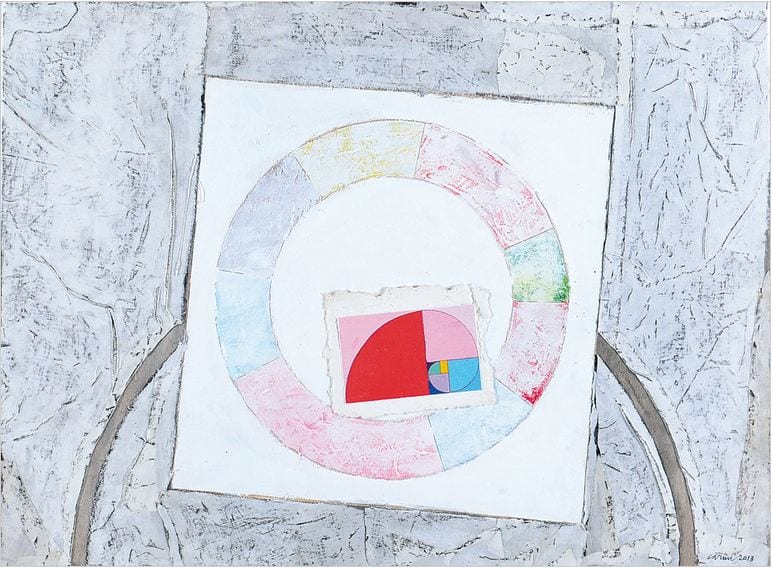 acrilici, pastelli e collage su tavola di legno, cm. 41×56,5, firma e anno in basso a destra, titolo, anno e tecnica al retro, dichiarazione d’autenticità e archivio dell’artista su foto.