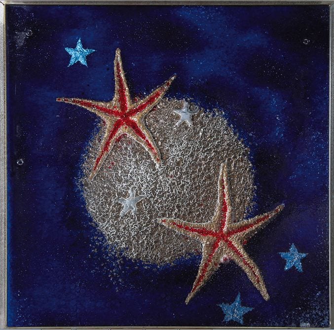 resine, oggetti, colore serigrafico, carta, legno su faesite cm. 50×50, firma, archivio dell’artista e descrizione dell’opera al retro, dichiarazione d’autenticità e archivio dell’artista su foto, entro teca in plexiglass.