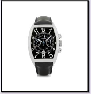 Lotto 100 FRANCK MULLER CASABLANCA CRONOGRAFO REF. 8885 C CC DT N. 1729 SERIE ATTUALE. Cassa tonneau in acciaio con fondello chiuso da viti e pulsanti rettangolari (ottimo). Quadrante nero con grandi numeri arabi e lancette luminescenti, contatore a 30 minuti e 12 ore, divisione 60 minuti/secondi al centro, data al 6 (come nuovo). Movimento a carica automatica con rotore in platino (ottimo). Quadrante, cassa e movimento firmati. Completo di cinturino in caucciù e fibbia in acciaio originali, astuccio e certificato. Dim. mm 56×40. base d’asta: 5.000 €