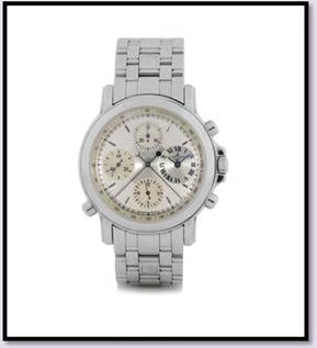 Lotto 196 ULYSSE NARDIN BERLIN 1907 CRONOGRAFO RATTRAPPANTE ANNI ’90. Cassa in acciaio con riproduzione della medaglia ricevuta all’esposizione di Berlino del 1907 sul fondello chiuso da viti, pulsanti tondi, terzo pulsante per lo sdoppiamento della lancetta dei secondi all’ 8 e vetro zaffiro (buono). Quadrante argentato guilloché con indici applicati, contatori in madreperla a 30 minuti e 12 ore, ore e minuti decentrati al 3 con numeri romani, scala tachimetrica periferica (ottimo). Movimento a carica automatica (ottimo). Bracciale in acciaio con chiusura a scomparsa. Quadrante, cassa e movimento firmati. Completo di astuccio e certificato del 06/1997. Diam. mm 40. base d’asta: 4.000 €